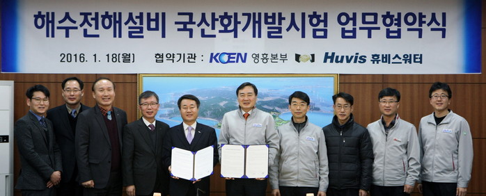 KOEN 한국남동발전(주) 영흥본부(본부장 김학빈)는 1월 18일(월) 본부 내 청백리실에서 (주)휴비스워터와 해수전해설비 국산화 개발시험의 성공적 추진을 위한 업무협약을 체결했다고 밝혔다.