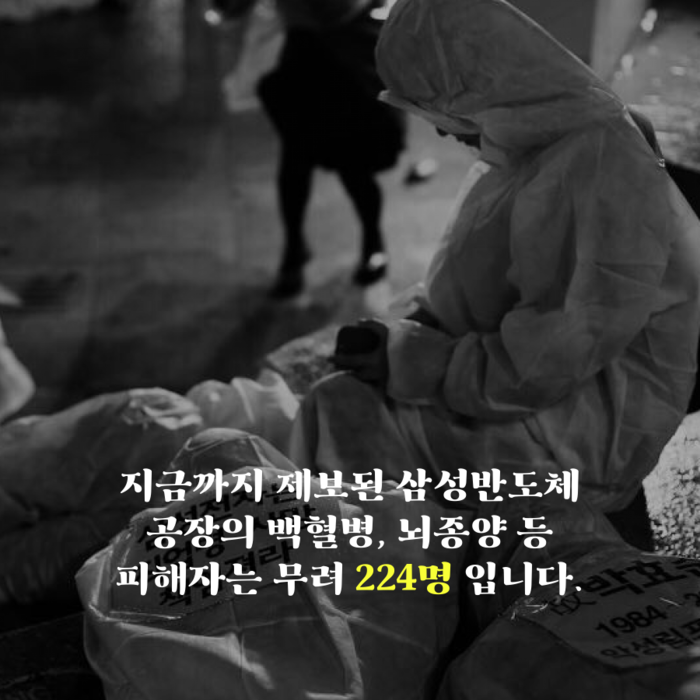 지금까지 드러난 삼성반도체/LCD 공장에서만 230여명의 피해자는 20~30대로 백혈병, 뇌종양 등 중증 질환으로 고통 받고 있다. 피해자들은 치료비와 생계문제 고통속에 그 중 79명이 안타깝게 사망했다.
