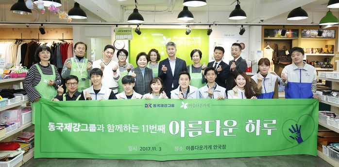 | ▲지난 주, 동국제강 장세욱 부회장(뒷줄 우측에서 4번째)과 아름다운가게 홍명희 이사장(뒷줄 우측에서 6번째)이 봉사자로 참여한 동국제강 임직원들과 기념 촬영을 하고 있는 모습. |