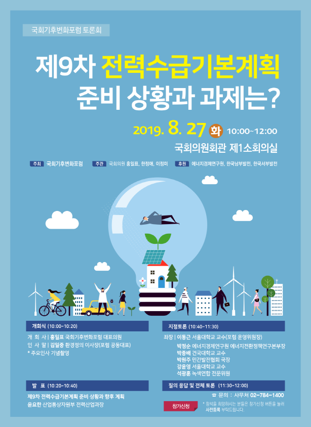[환경데일리 김영민 기자]범국민적인 기후변화 대응의 입법·정책 거버넌스를 추구하는 국회기후변화포럼(대표의원 홍일표·한정애)은 8월 27일 의원회관 제1소회의실에서 '제9차 전력수급기본계획 준비상황과 과제' 주제로 토론회를 개최한다.