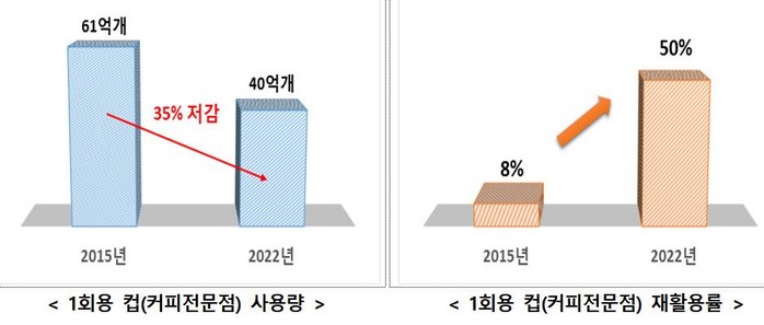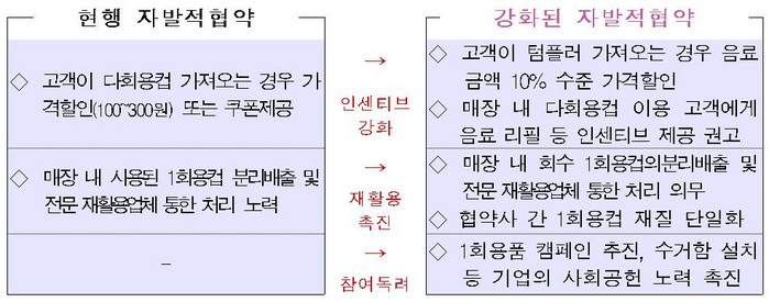 일회컵을 가장 많이 사용하고 있는 스타벅스, 이디야, 투썸플레이스, 할리스, 카페베네, CJ 뚜레쥬르, SPC 파리바게뜨 등 우선 사용 감소를 위해 자발적 협약을 강화하기로 했다. 대신 텀블러 사용시 10% 선에서 커피음료 등 가격할인, 매장 내 머그컵 사용시 리필 혜택 등을 제공할 예정이다. 그러나, 가맹주 프랜차이즈 업계는 일회용컵을 인건비, 물사용량을 부담을 이유해 머그잔을 꺼려 일회용컵을 사용하는 강수가 변수다.