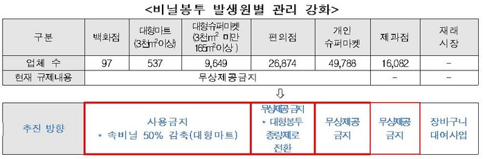 대형마트, 대형슈퍼는 비닐봉투 대신 종이박스, 재사용 종량제봉투 등만 사용토록 하고, 매장 내 속비닐 사용량도 50% 감축할 계획이다. 또한 각 상품별로 포장이 아닌 제품 구매시 일부 할인을 더 해주는 방식으로 판매전략과 정부의 재활용정책에 부흥한다는 계획도 마친 상태다.