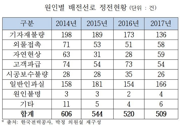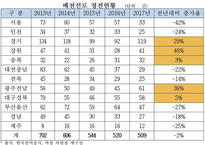 박정 의원실은 자체 분석한 결과, 배전선로 정전현황은 2013년 702건에서 2017년 509건으로 점점 줄고 있으나 일부지역은 전년대비 오히려 증가한 것으로 밝혀졌다.
