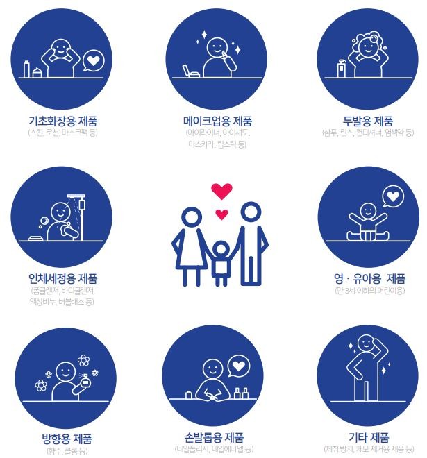 화장품 관련 제품은 크게 기초화장품, 메이크업용 제품, 두발용 제품, 인체세정용 제품, 영유아용제품, 방향용 제품, 손발톱용 제품, 체취방지 등 기타 제품군으로 종류만 수백여 개 가지다.