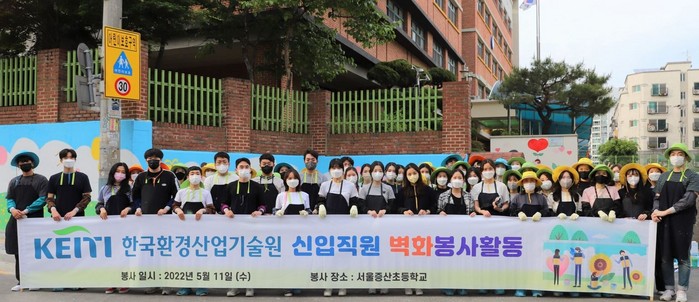 [환경데일리 김영민 기자]한국환경산업기술원(KEITI) 신입직원 50여 명이 11일 오후 서울 은평구 소재 증산초등학교 담벼락을 벽화봉사활동을 폈다.