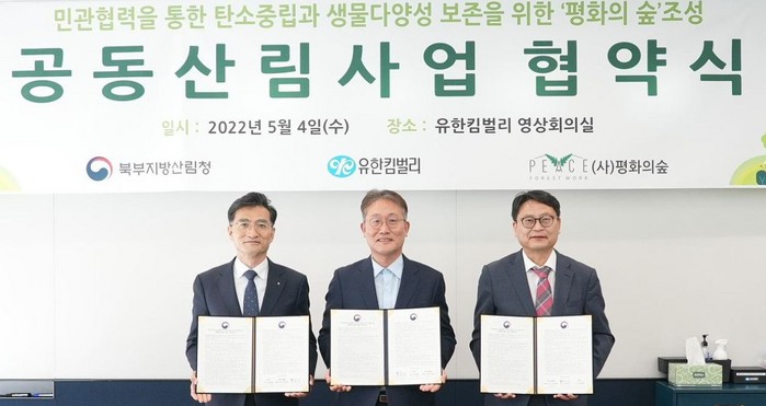 | ▲유한킴벌리 본사에서 진행된 ‘멸종위기종 생태복원숲’ 협약식 모습. 왼쪽부터 진재승 유한킴벌리 사장, 김재현 평화의숲 대표, 최수천 북부지방산림청장. /유한킴벌리 제공 |