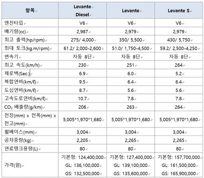 | ▲마세라티 유일한 SUV 르반떼 제원 |