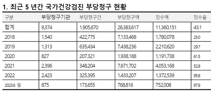 5년간 건강검진 기관 부당청구 263억 징수 43.1%
