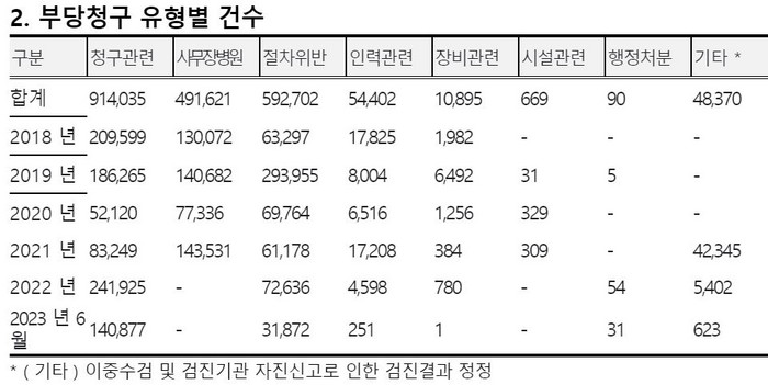 부당청구 유형별 현황을 보면 청구관련이 가장 많았고 사무장병원, 절차위반, 인력관련 순이다. 유형별 환수결정금액은 사무장병원이 171억 7399만원, 절차위반이 46억 6769만원, 청구관련이 28억 4250만원으로 불법개설 의료기관이 차지하는 부당청구가 가장 많았다.