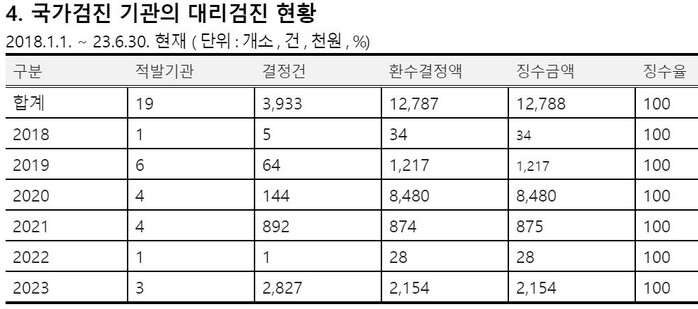 최근 5년간 적발된 건강검진 대리검진은 총 3933건으로 18년 5건, 19년 64건, 20년 144건, 21년 892건으로 증가추이를 보이다가 22년 1건뿐이었던 대리검진이 올 상반기에만 2827 건 적발됐다.