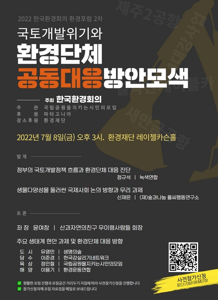 이날 발제는 ▲정부의 국토개발정책 흐름과 환경단체 대응 진단(정규석, 녹색연합) ▲생물다양성 둘러싼 국제사회 논의 방향과 우리 과제(신재은, (재)숲과나눔 풀씨행동연구소)를 발표한다.