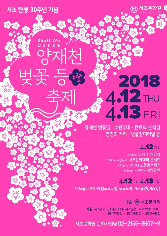 서초 탄생 30주년 기념으로 열리는 이번 축제는 '벚꽃과 함께 춤 출까요'는 주제로 벚꽃길 곳곳에 LED 야간 경관조명이 양재천변을 밝게 비쳐주며, 흐르는 물길을 따라 벚꽃, 물고기, 동물 모양 등의 유등이 떠내려가고, 벚꽃이 흩날리는 풍경을 연출한 에코 등(燈)터널 등 야간 방문객들에게 화려한 벚꽃놀이가 펼쳐진다.
