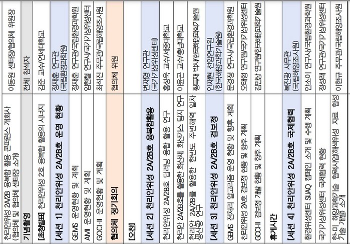 이어서 ▲기관별 위성 운영 현황 ▲기관 간 업무협의체 정기회의 ▲천리안위성 2호 융복합 활용 기술개발 전문가 ▲기관별 위성 검·보정 현황 및 국제협력 분야 발표가 이어졌다.