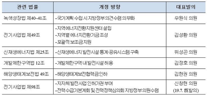 더불어민주당 기후변화대응 및 재생에너지산업육성 특위(위원장 우원식)는 2019년 마지막 날 지역 에너지 분권 실현을 위한 5대 법안(녹색성장법, 전기사업법, 신재생에너지법, 개발제한구역법, 해양생태계법)을 발의했다.