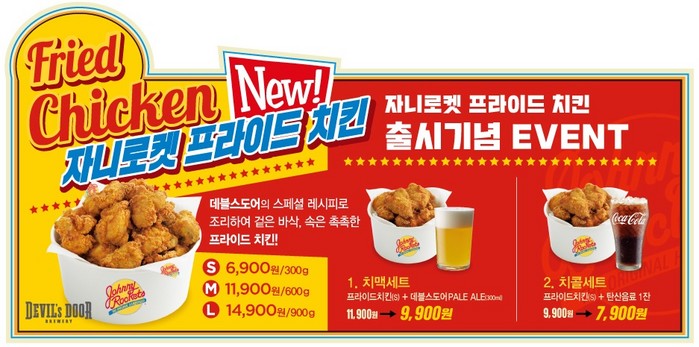 자니로켓 프라이드 치킨은 100% 국내산 닭고기에 이탈리안 파슬리, 타임, 바질 등의 4가지 허브와 레몬라임향으로 숙성시킨 후 아메리칸 스타일 게스트로펍 데블스도어의 스페셜 레시피로 조리해 겉은 바삭하고 속은 촉촉한 게 특징이다.