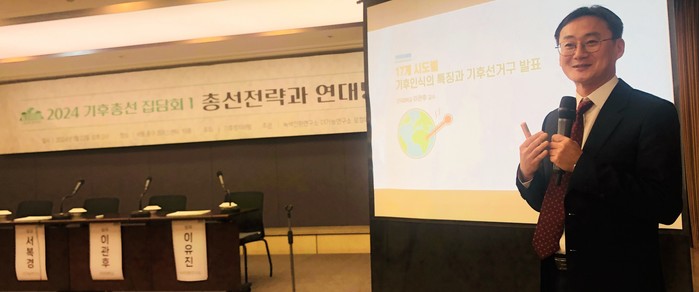 ▲이관후 건국대 교수가 전국 17개 시도별 기후인식의 특징과 기후선거구에 대해 발표하고 있다. |