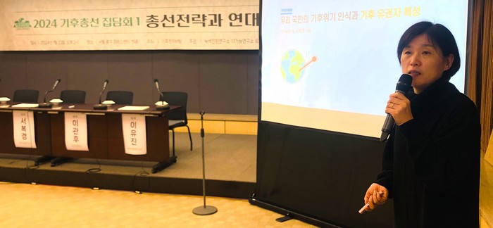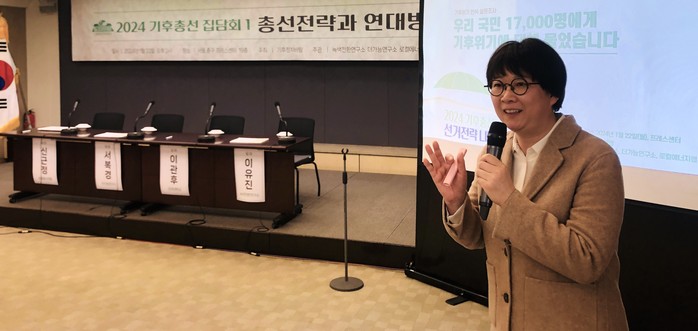 ▲서복경 더가능연구소 대표는 우리 국민들이 느끼는 기후위기는 점점 커지고 있다며 기후 유권자들의 특성이 오는 총선에서 그대로 영향을 미칠 수 있다고 말했다. |