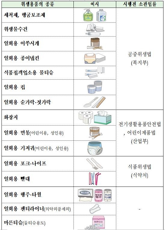 현재 시판중인 위생용품 19종은 세척제(주방세제), 헹굼보조제, 음식점용 물티슈·물수건, 종이냅킨, 일회용 컵·숟가락·젓가락·포크·나이프·빨대, 이쑤시개, 화장지, 일회용 면봉·기저귀·팬티라이너, 일회용 행주·타월·마른티슈 까지다.