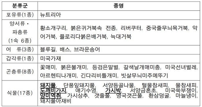 생태계위해성 평가를 거쳐 환경부 장관이 지정·고시하는 생물종으로 2023년 현재 식물 17종 등 총 1속 36종(포유류 1종, 양서파충류 1속 6종, 어류 3종, 갑각류1종, 곤충류 8종)이 지정된 상태다.