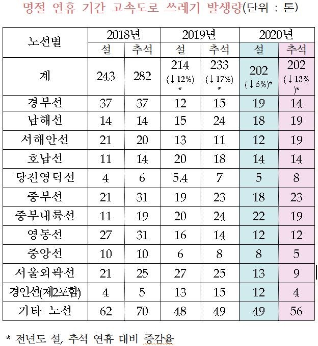 국회 환경노동위원회 소속 노웅래(서울 마포 갑) 의원이 한국도로공사로부터 받은 자료에 따르면, 20년도 설 연휴기간 발생한 고속도로 쓰레기량은 총 202톤으로 하루 평균 발생한 고속도로 쓰레기량 18.9톤 보다 약 10배 이상 더 발생하는 것으로 나타났다.