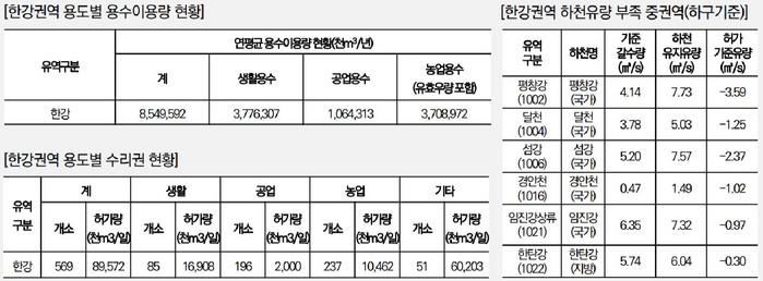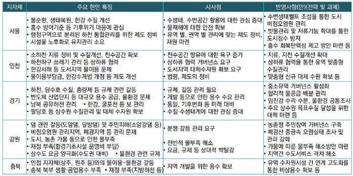강원지역 경우 댐은 많지만 댐 갈등과 탁수 관리, 가몸에 따른 물이용 문제 등까지 수면 위로 올랐다. 경기도는 반도체클러스터 조성으로 SK하이닉스, 삼성반도체의 물이용 문제까지 거론되고 있다. 또한 왕숙천 생태하천복원 예산낭비 우려, 시화호 유역의 오염원 관리, 구리시 등 지자체 공공하수처리시설(신설과 증설 갈등), 수도권 상수원 다변화 등 48개 항목이 모아졌다.