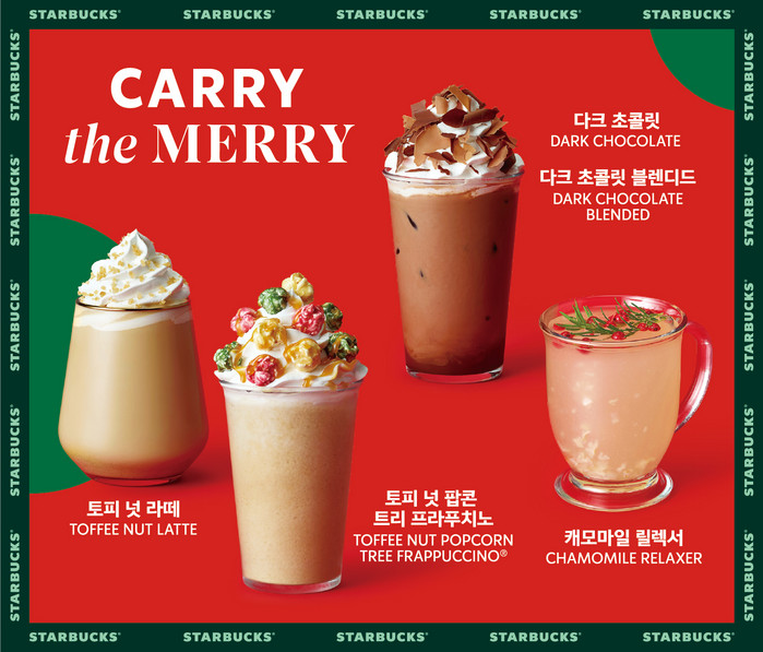 매년 크리스마스 시즌에만 소개하는 시그니처 음료인 '토피 넛 라떼'를 비롯해 크리스마스 트리의 반짝이는 장식물을 다양한 색상의 팝콘으로 표현한 '토피 넛 팝콘 트리 프라푸치노', 리치, 레몬그라스, 캐모마일이 어우러진 '캐모마일 릴렉서', 달콤 쌉싸름한 맛으로 마치 크리스마스 초콜릿 케이크를 재현한듯한 '다크 초콜릿'등 음료 4종을 출시했다.