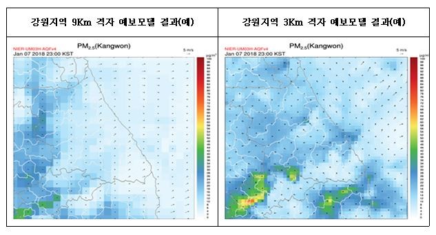 기존 수도권 미세먼지 예보에만 적용하던 3km 격자 간격의 고해상도 예보를 강원(영서·영동) 지역에 확대 시행(기존 9km)해 경기장 주변의 상세한 예보를 2월 1일부터 제공할 예정이다.