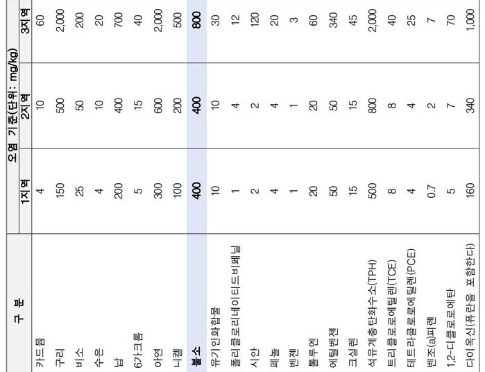 주거지역이나 임야, 농지 등 기준은 400mg/kg, 공장 등 산업지역은 800mg/kg으로 사업체(주) 시선에서 기준치 터무니 없이 높게 적용됐다.