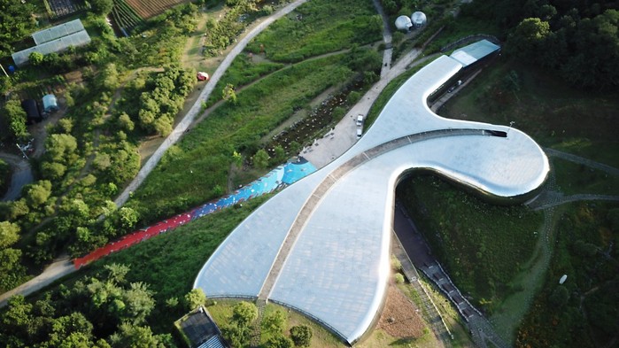 전곡선사박물관은 독특한 외관이 눈길을 끈다. 기다란 곡선형 건물은 국제 설계 공모를 거쳐 프랑스 건축 팀이 설계했다. 외형은 원시 생명체인 아메바와 미래 지향적인 우주선 모양이고, 스테인리스 판을 덮은 외벽은 뱀 비늘을 모티프 삼아 빛을 받으면 반짝거린다.