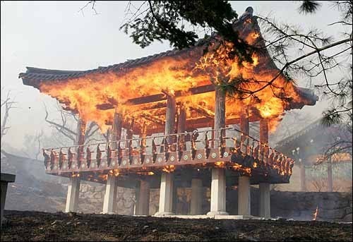 ▲2005년 양양 낙산사 화재로 전소됐을 만큼, 강한 강풍으로 산불이 번지면서 전국적으로 비상이 걸린 상태다. |