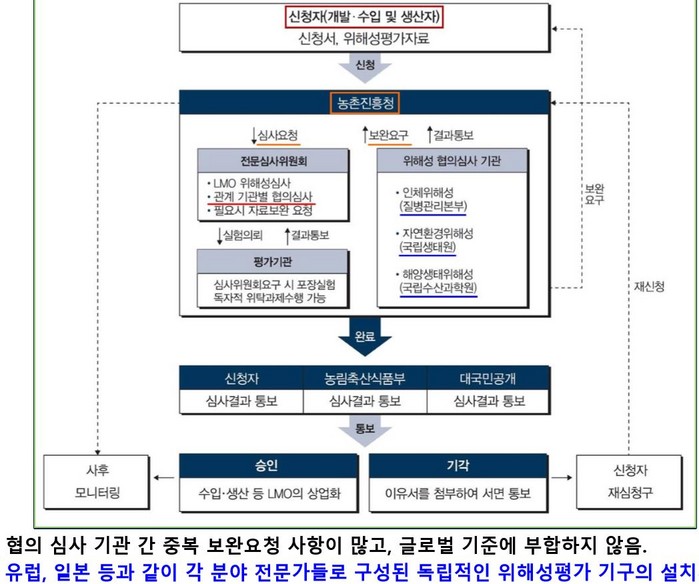 검토 분야의 중복, 전문가 수 부족에 따른 전문성 약화, 행정력 낭비, GMO개발자 의욕 저하도 크다는 애로사항을 밝혔다.