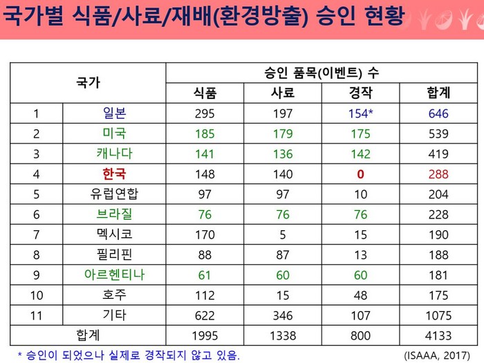 그럼 2017년 기준으로 GMO 재배와 승인은 어느 정도 차지되고 있을까. 미국을 비롯해 26개국으로 총1억8510만 ha에 달하는데 1996년 대비 무려 112배 증가했다. 우리나라 면적으로 약 20배 이상 확대된 상태다.