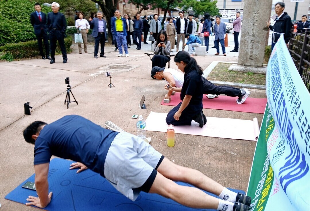 현대전통정통팔굽혀펴기 창시자인 현달형 총재는 대회 준비에 앞서 8일 광화문광장 이순신 장군 동상앞 홍보를 펼쳤다.