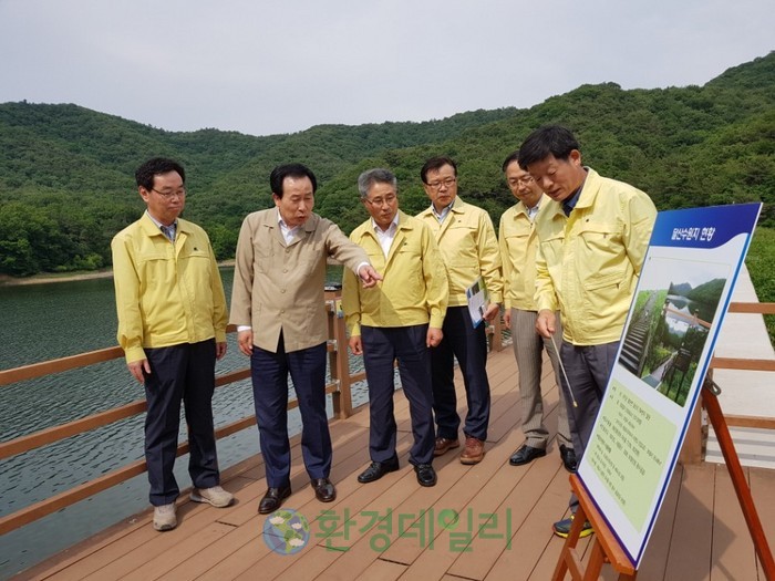 ▲박홍률 목포시장, 가뭄 심각성에 따라 달산수원지 현장 방문을 관계자들로부터 설명을 듣고 있다. |