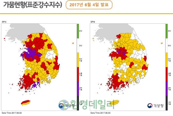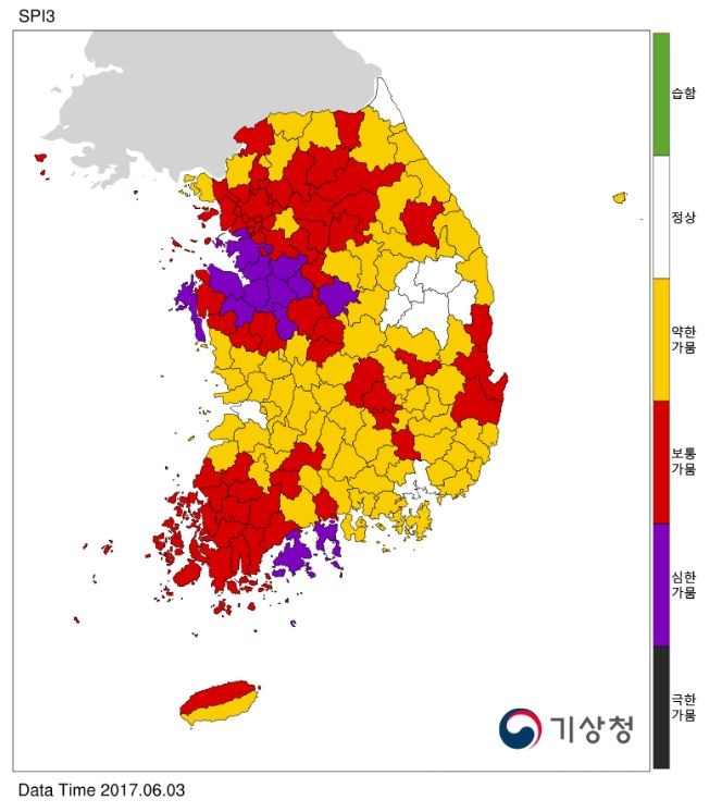 ▲전국적으로 가뭄 심한 단계 진입을 앞두고 있다. 빨간색 지역은 보통가뭄이지만 앞으로 10일내 충분한 비가 오지 않으면 심한 가뭄으로 진입단계로 들어갈수 밖에 없다. 검은색과 보라색으로 표시된 극심한 가뭄지역은 도서지역이다. |