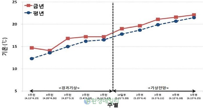 최근 4주간(4.20.~5.17) 강수량은 28.1㎜로, 평년(100.1)보다 72.0㎜ 적었다. 특히, 동해안 중부지대(울진, 영덕 등)의 5월 3주차 최고기온의 평균은 23.3℃로, 평년(20.8)보다 2.5℃ 높았다. 지구온난화의 영향권이 한반도에 직접 영향을 주고 있다.