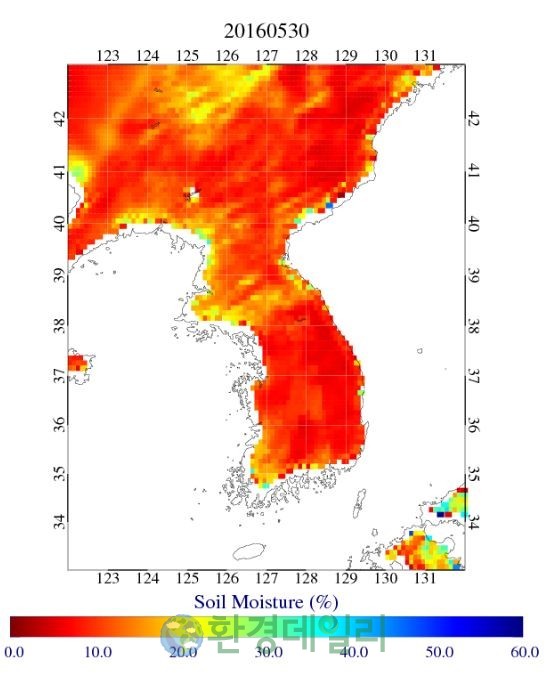 ▲한반도 토양에 수분이 증발된 상태다. 붉은 빨간색일수록 토양에 수분함유량이 적다. 사진은 2016 년 일년전 토양수분량 표시 |