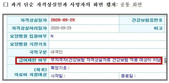실제로 개선 이전엔 사망자의 성명과 주민번호를 불법으로 도용한 후 의료기관에 제시해도 건보 수진자 시스템엔 사망 여부가 표시되지 않았다. 자격상실인으로 조회되기 때문에 건강보험 급여를 받지 않겠다고 하면 사망자 명의로 진료·처방이 가능한 허점이 존재했던 것.