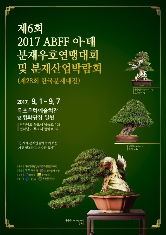 한국 분재의 멋과 전통성을 세계에 알리고 국내분재산업의 활성화를 위한 2017 아시아태평양분재우호연맹(ABFF)대회와 분재 산업박람회가 목포문화예술회관 및 평화광장 일원에서 9월 1일부터 7일까지 개최된다.