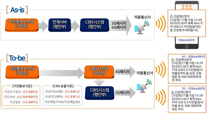 그동안 지진· 해일 재난문자는 행정안전부 시스템을 통해 발송해왔으나 앞으로는 기상청이 직접 발송함으로써 재난문자 전송 단계가 축소돼 문자 전달 소요시간이 1~5초가량 줄어들 것으로 기대된다.