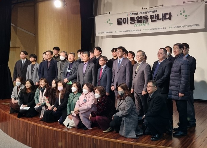 | ▲올 2월 고양시에서 '물이 통일을 만나다' 주제로 ESG 친환경 사회공헌 위한 세미나 첫 행사에서 참석자들과 기념사진을 찍고 있다. |