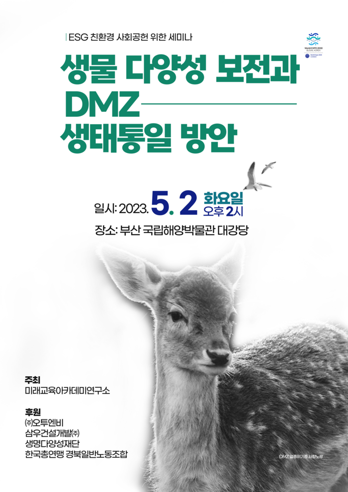이번 학술세미나는 '생물다양성 보존과 DMZ 생태통일 방안' 주제로 5월 2일 2시~ 5시까지 부산 국립해양박물관에서 개최된다.