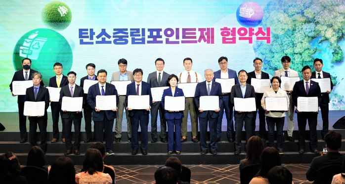21일 공단은 탄소중립포인트제(녹색생활 실천분야)의 활성화와 국민의 탄소중립 실천활동의 참여기회 확대를 위해 전자영수증 발급 등 탄소중립 실천항목 분야별 17개 기업이 신규로 제도에 참여하는 협약을 한화진 환경부 장관이 참석한 가운데 코엑스 그랜드볼룸에서 체결했다.