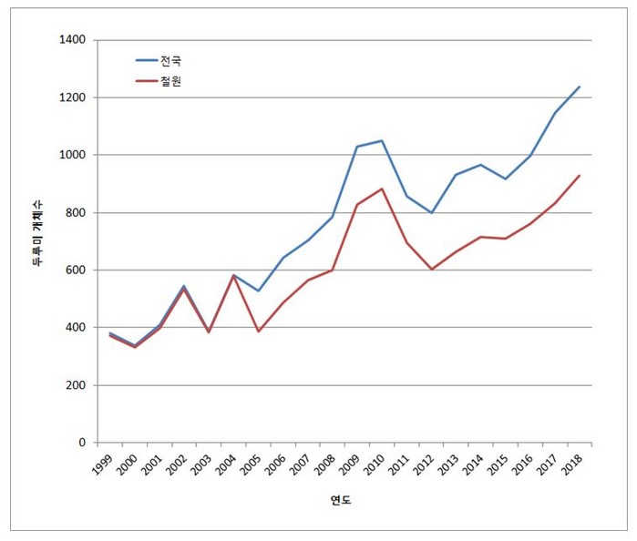 이는 겨울철 조류 동시센서스가 시작된 이래 관찰된 두루미의 최대 개체수에 해당한다. 철원평야를 찾는 두루미는 1999년 382마리를 시작으로 2008년 603마리를 기록하는 등 증가 추세를 보였다.