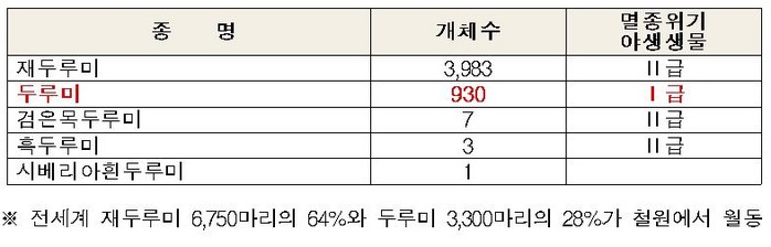 환경부는 1999년부터 겨울철 철새도래 상황을 파악하기 위해 겨울철 조류 동시센서스를 실시하고, 1월 19일부터 21일까지 실시한 철원평야 동시센서스에서는 두루미 930마리가 관찰됐다.