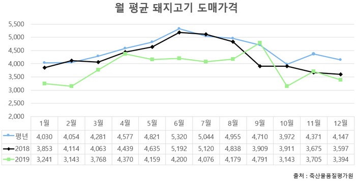 축산물품질평가원이 발표한 자료에 따르면, 12월(27일 기준) 전국(제주제외) 도매시장의 돼지고기평균(탕박.등외제외) 경매가격은 kg당 3394원을 기록했다.