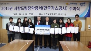 [환경데일리 최진경 기자] 한국가스공사와 한국장학재단은 23일 한국장학재단 대회의실에서 재정적 지원이 필요한 성적우수 대학생 및 고등학생에게 총 3억 원을 지원하는 사랑드림장학금 수여식을 가졌다.
