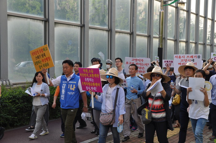 26일 늦은 오후 서울시 은평구 진관동 76-20번지 삼송테크노밸리 옆 창릉천 앞쪽 '은평광역자원순환센터' 생활쓰레기처리시설부지 앞에 고양시민, 서울시 은평뉴타운 주민 100여 명이 "환경에 영향없다는 증거를 제시하라." 등 구호푯말을 들고 행진했다.