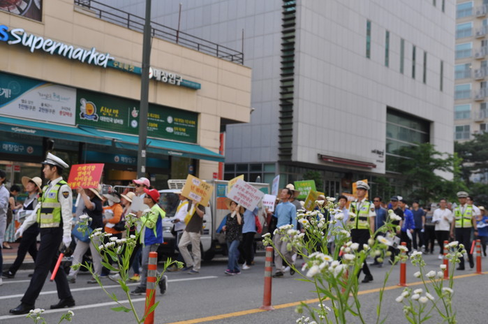 이상진 은백투 위원장은 메가폰으로 선두를 이끌며 선창 구호로 "쓰레기장 건립 결사반대", "친환경시설이면 구청앞에서 세우라." 등 미리 준비한 16여개 구호 속에 행진했다.