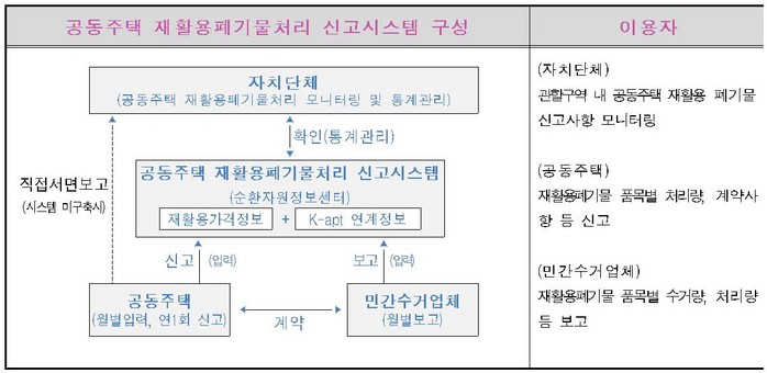한국환경공단은 지난해 공동주택에서 처리하는 재활용폐기물 처리실적과 방법, 계약사항을 온라인을 통해 전자적으로 신고할 수 있도록 순환자원정보센터(www.re.or.kr)에 신규시스템을 구축하고 11월에 법률  시행과 함께 본격 운영할 예정이다.